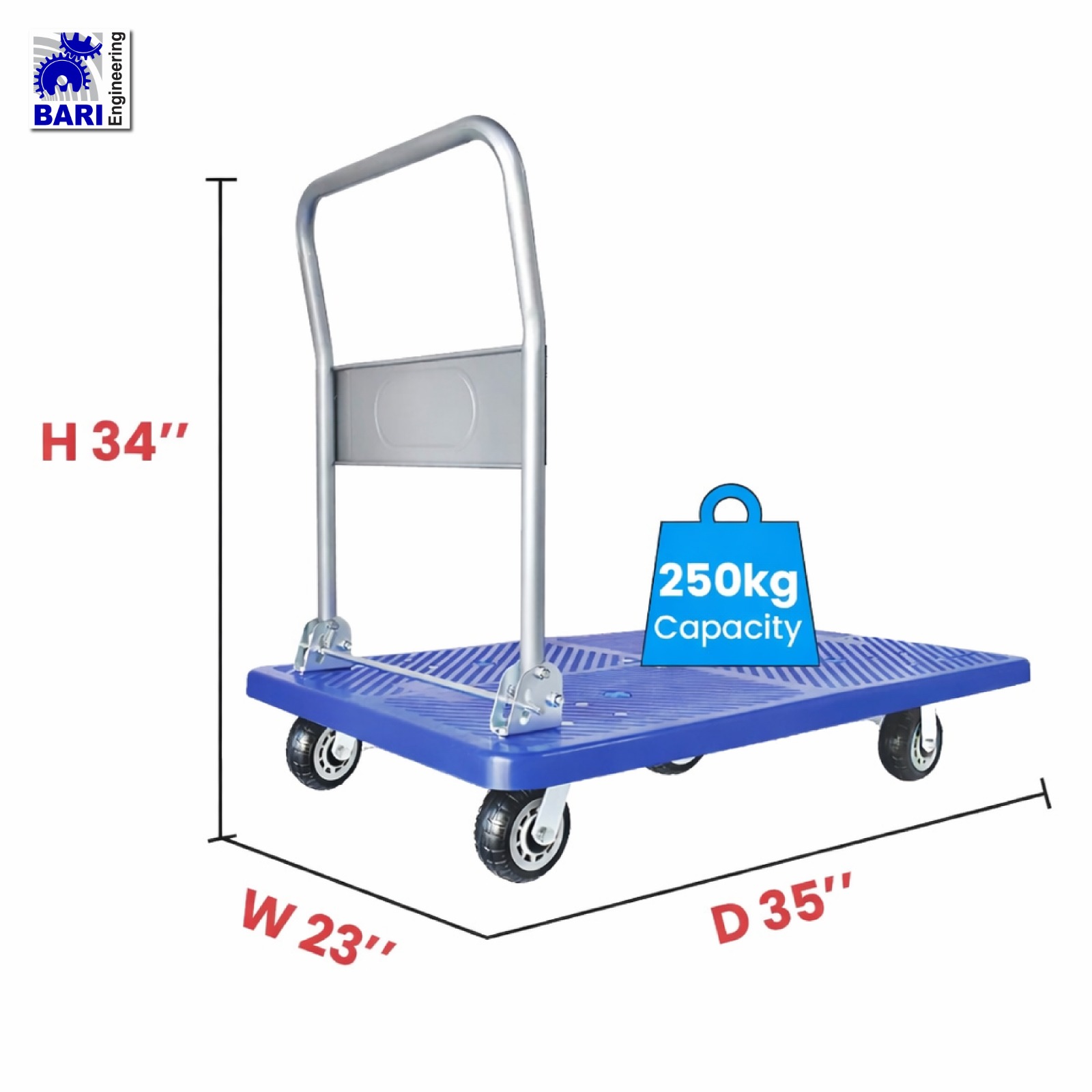We supply high-performance 250kg Platform Trolleys built with anti-slip surfaces and reinforced frames, ensuring stability even on uneven floors. For more compact spaces, our Single Plastic Platform Truck Trolley 250 Kg is lightweight yet strong, perfect for both indoor and outdoor use.