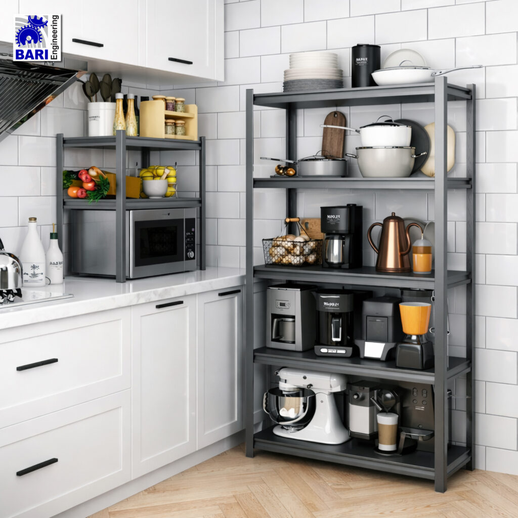 Freestanding Racks: These are versatile and can be placed anywhere in the kitchen. They are suitable for storing heavier items like pots, pans, and appliances. A kitchen rack stand also can be used as a kitchen dish rack for extra storage.