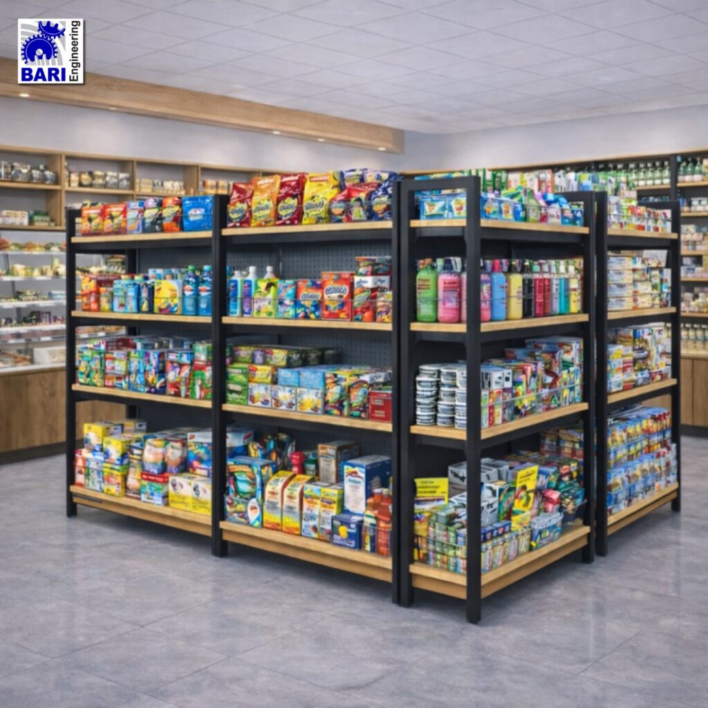 Efficient Display: Our racks effectively make use of the store’s perimeter, optimizing product visibility and creating an organized shopping experience for customers.