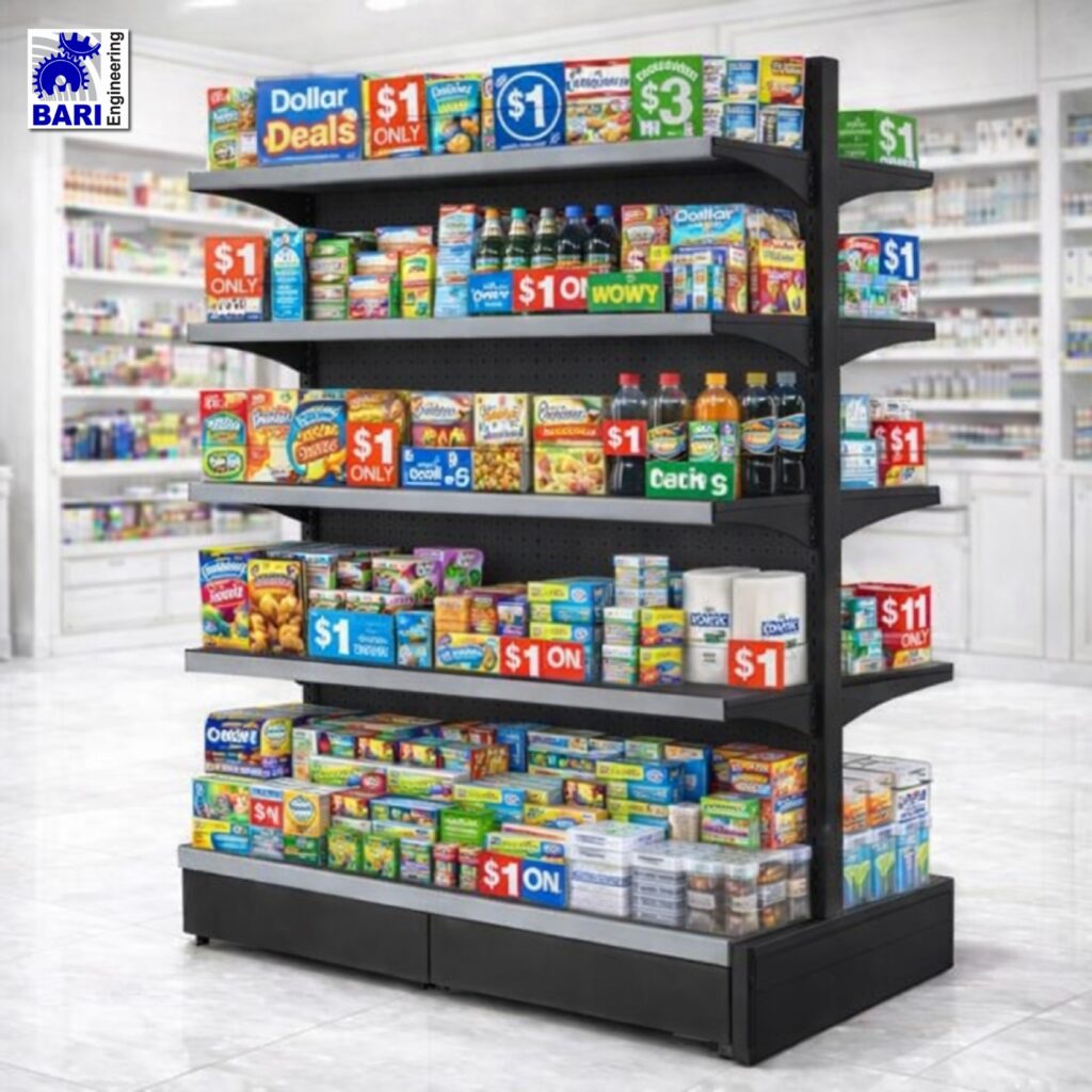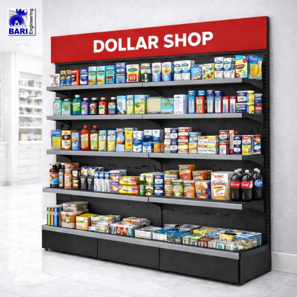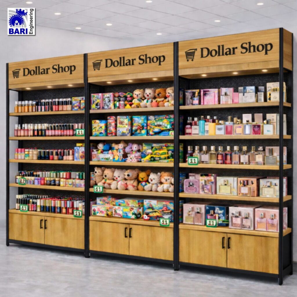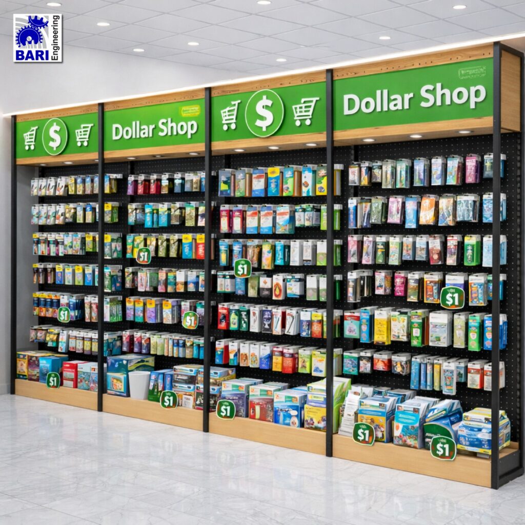 Welcome to Bari Engineering, your destination for affordable and efficient display solutions for your Dollar Shop Racks merchandise. We design our high-quality Dollar Shop Racks to maximize space utilization, enhance product visibility, and create a pleasant shopping experience for your customers. Whether you need a Wholesale Dollar Shop Display Rack or a specific Dollar store shoe rack, we have you covered.