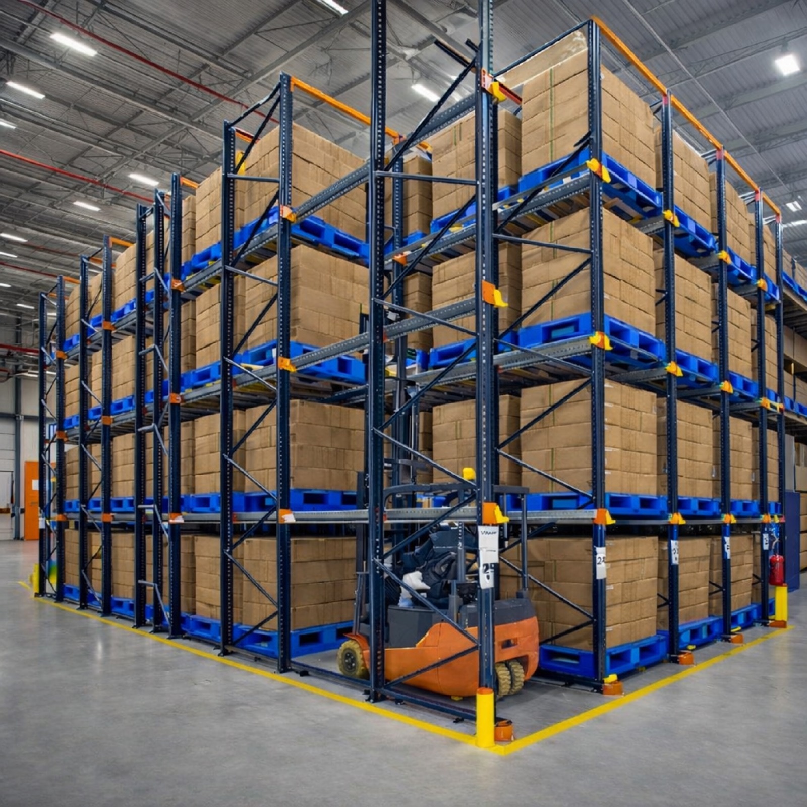 Under this system, forklifts move directly into the rack lanes to unload and load pallets. The pallets are placed on powerful horizontal rails rather than conventional beams.