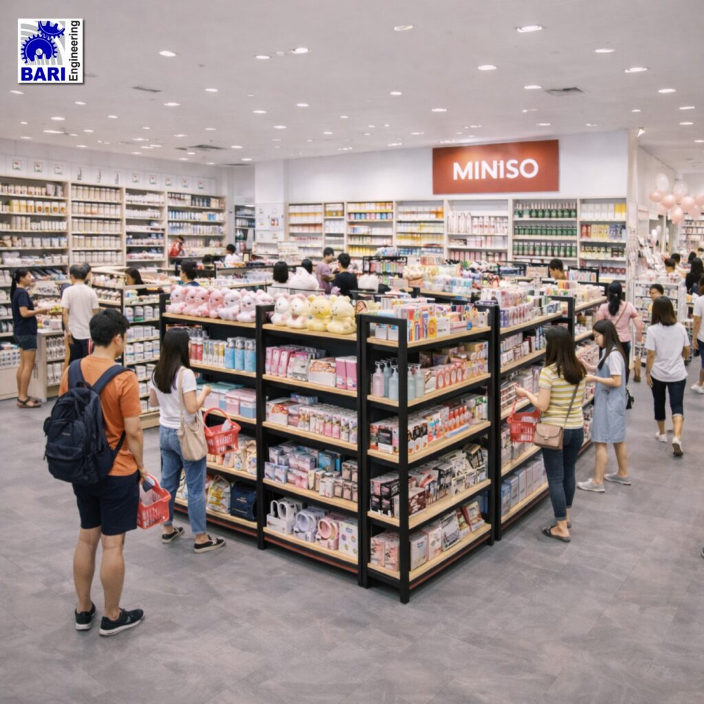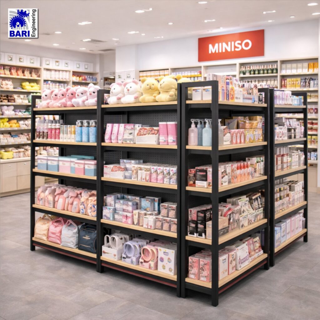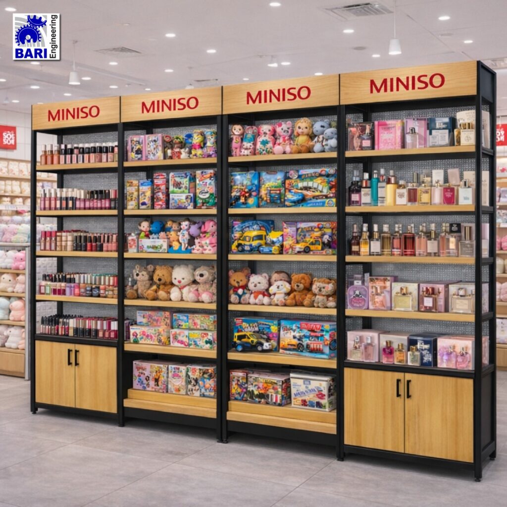 Stylish and Modern: Their sleek design seamlessly integrates with Miniso aesthetics, enhancing your store’s visual appeal using a modern Miniso Shop Rack.
