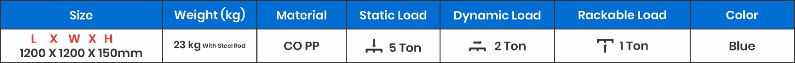 The Plastic Pallet With 5 Steel Rods Is A High-Perfomance, Rackable Pallet Designed For Industrial Strength And Long-Term Durability. Manufactured Using Premium COPP (Co-Polymer Polypropylene), This Pallet Offers Superior Load-Bearing Capacity.
