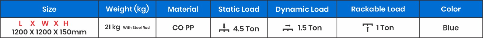 The Plastic Pallet With 6 Steel Rods Delivers Exceptional Strength, Rackability, And Long-Term Reliability. Manufactured Using HighGrade COPP Material.Reinforced With 6 Steel Rods, This Pallet Ensures Maximum Stability During Storage And Transport.